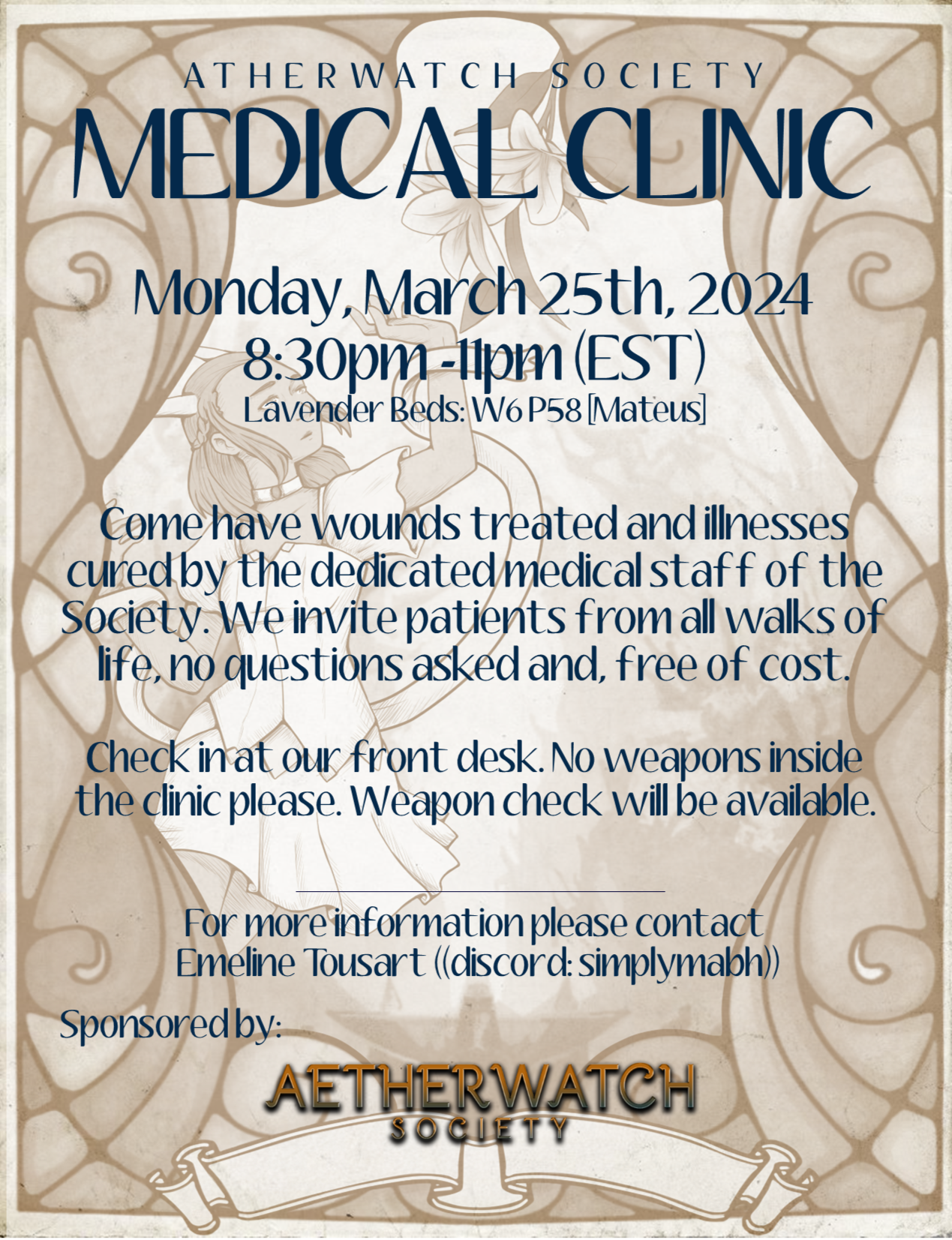 Come have wounds treated and illnesses cured by the dedicated medical staff of the Society. We invite patients from all walks of life, no questions asked and, free of cost.The Society specializes in medical and aetherical maladies, severe injuries and consults on magical issues.The Clinic at Aetherwatch Society is open to all in need. There are open clinic nights, private consultations by appointment, and healer's workshops available.